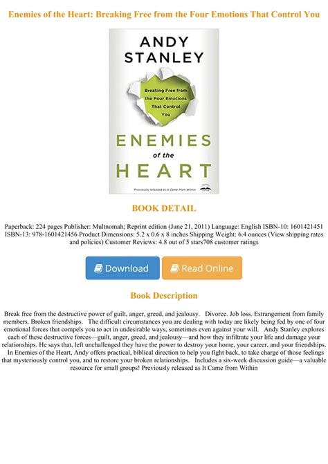 Read Online Enemies of the Heart Breaking Free from Emotions that Control PDF online is a convenient and frugal way to read Enemies of the Heart Breaking Free from Emotions that Control you love right from the comfort of your own home. Yes, there sites where you can get PDF "for free" but the ones listed below are clean from viruses and completely legal to use.